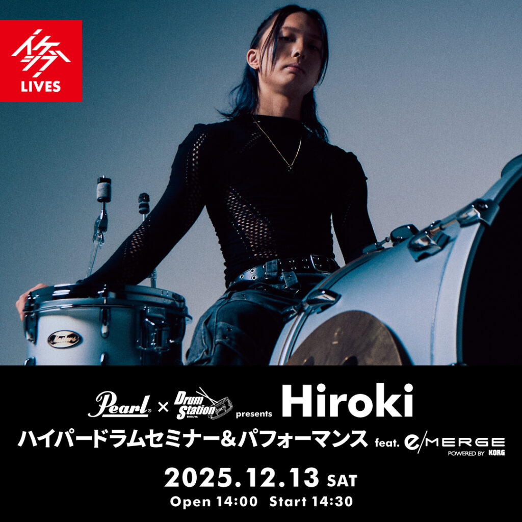 活動の主戦場としている、メタルコア、ラウドロックならではの超絶ドラムパフォーマンスをPearl×KORG共同開発の「e/MERGE PRO」で披露しつつ、自身のドラム理論やフットワークテクニック、e/MERGEの主な機能説明を併せて時間の許す限り解説していただきます。